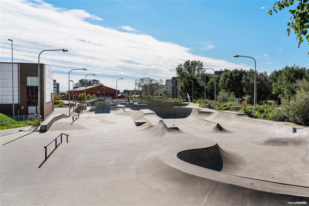 I närområdet finns en stor skatepark och upplyst motionsslinga.