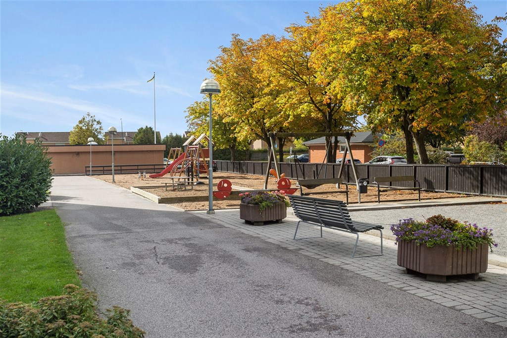 Trevlig utemiljö med lekplatser, bandyplan, boulebana och flera uteplatser med grillmöjlighet.